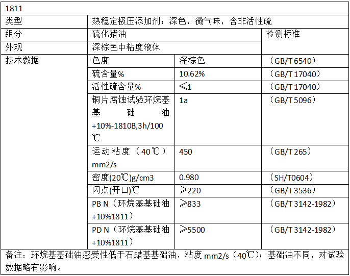 硫化豬油1811是一款深色、微氣味的非活性硫化極壓抗磨劑,具有粘度大、黏附性好、油膜厚、抗磨性高的特點,適合在沖壓拉伸等塑性變形工藝作為主劑使用,調(diào)和中端沖壓油、拉伸油;也可在膠粘行業(yè)作為助劑使用,經(jīng)濟(jì)適用性強。